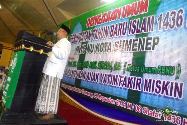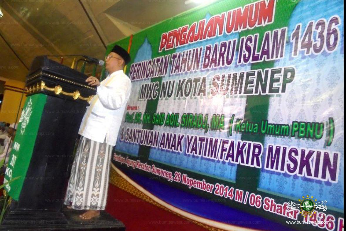 Sabtu malam, 06 Shafar 1436H / 29 Nopember 2014 M di Pendopo Agung Keraton Sumenep dilaksanakan Pengajian Umum dan Peringatan Tahun Baru Islam 1436 H. Pengajian yang digelar MWC NU Kota Sumenep ini menghadirkan Ketua Umum PBNU Prof. Dr. KH. Said Aqil Siradj, MA. Ribuan warga Nahdlatul Ulama dari berbagai daerah memenuhi pendopo. Hadir Bupati Sumenep dan jajaran perangkat daerah, Ketua DPRD, Pengurus PCNU, MWC, ranting dan Banom NU se Kabupaten Sumenep. Pada acara tersebut juga diberikan santunan kepada fakir miskin dan anak yatim. (Zbr)
